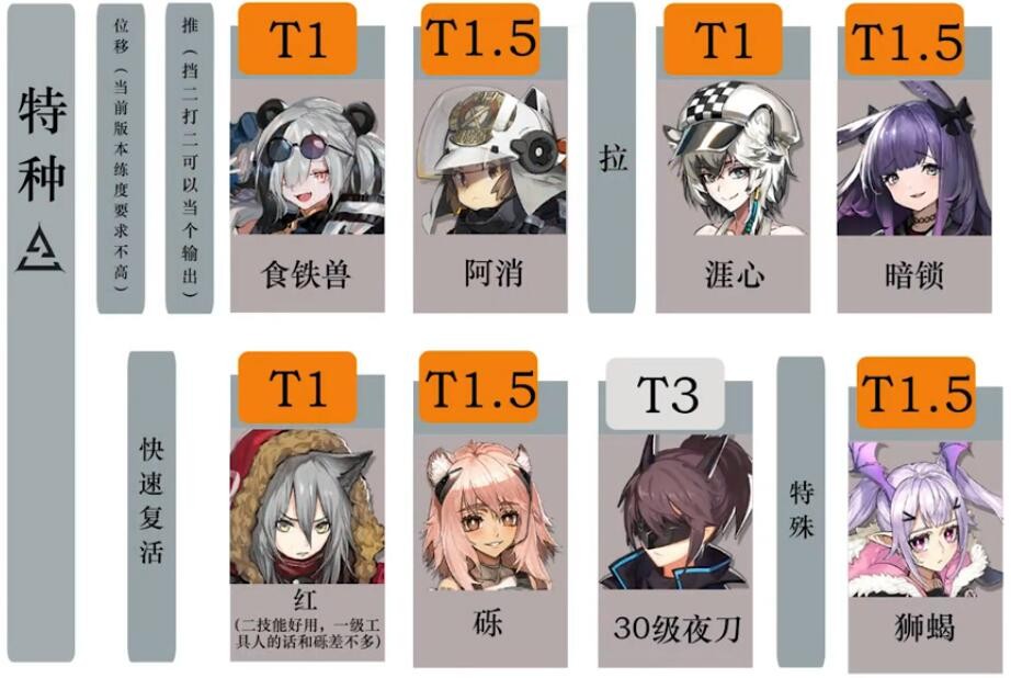 【位移】:就是能将敌人推开、拉过来的干员,等级无所谓,优先将技能升至4级