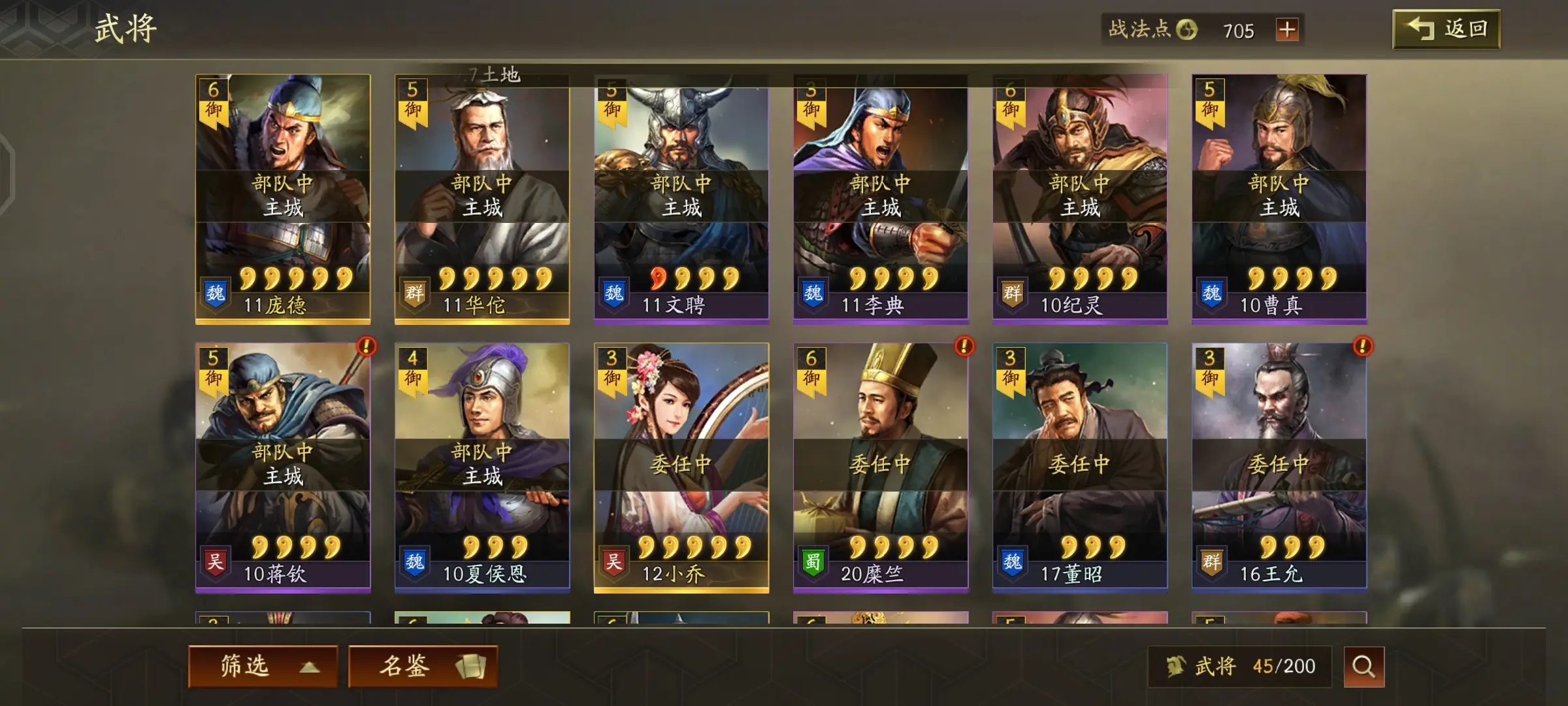 1、在这个游戏的地图行军过程中,武将出征会有几个状态:兵力、体力和士气,兵力和体力能决定武将出征的战斗力和次数。而士气,随着出征距离增长而减少,直接影响伤害输出能力;另外开局有概率触发武将单挑,在武将单挑失败的时候,士气会下降,造成伤害会降低。