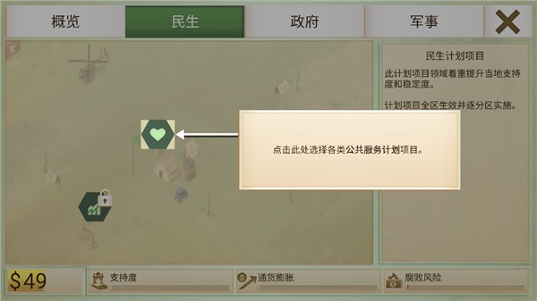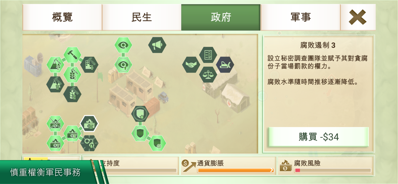游戏经济树分为民生、政府和军事。这些科技点,均需要依靠金钱加点维持,投资民生,可以增加民众的支持度,但也会导致通货膨胀和腐败风险,通货膨胀只能靠时间自动下降,而腐败需要投资政府来遏制腐败。