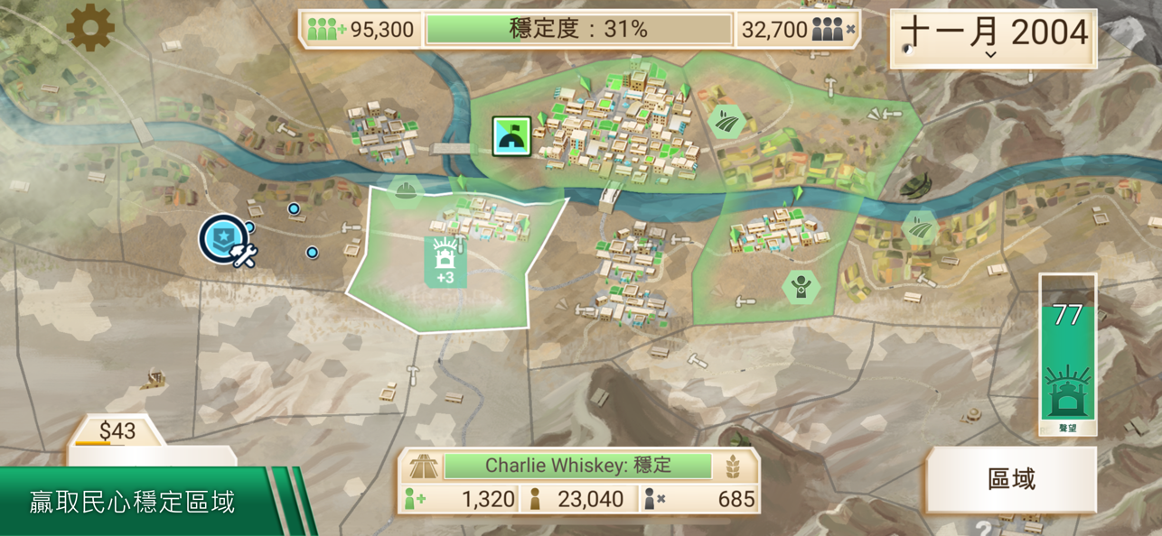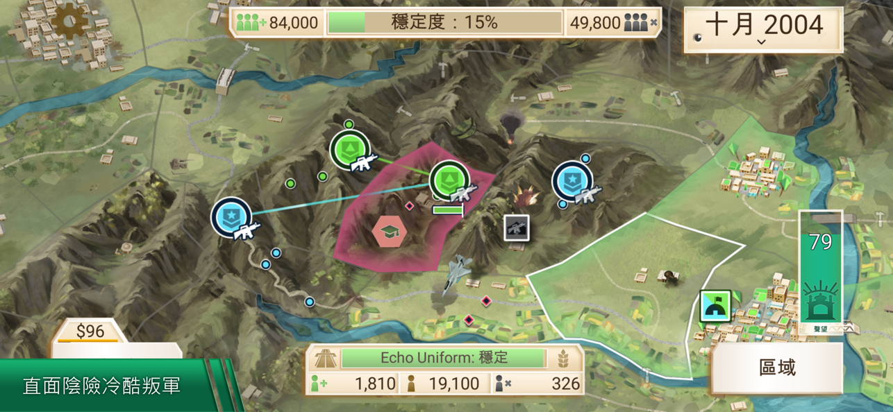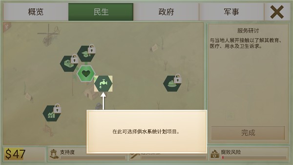 想要快速击败叛军势力,选择空袭,也可能会伤及无辜,导致平民怨气,另外军事行动也必不可少了金钱,如何平衡支出和收入也是玩家所要面临的一大难点。