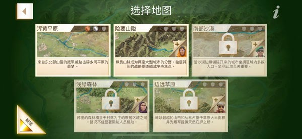 游戏对地理规划依旧十分严谨,玩家需要考虑何时将自己的势力范围对外扩张,又需要计算如何利用地域优势,把叛军势力逐个击破。游戏共有五张地图,分别是“浑黄平原”、“险要山隘”、“南部沙漠”、“浅绿森林”与“边远草原”。