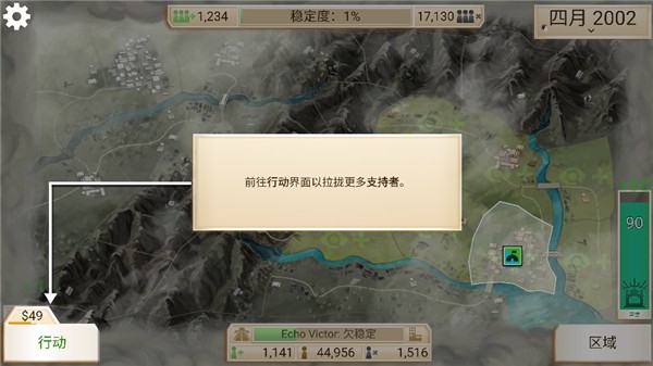 6、稳定度基础在于支持者的数量,所以玩家需要采取措施来赢得民心,我们点击行动也,拉拢更多支持者,