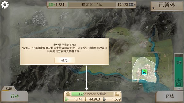 11、下方区域会显示分区稳定程度以及区域内支持者数量,随着供水系统改善,支持者数量也会不断增加,之后就需要玩家自己慢慢探索啦,以上就是Rebel Inc中文版的玩法了。
