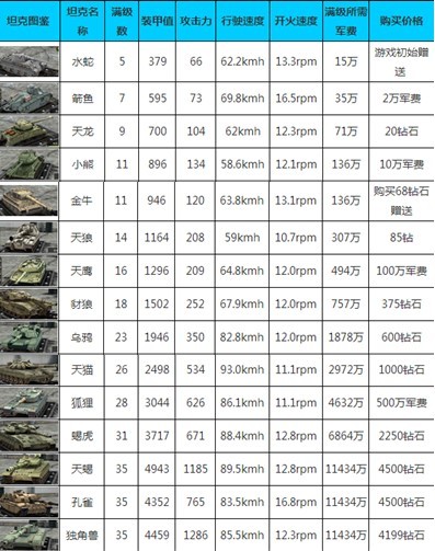 表格中给我们显示了坦克价格、升级费用、以及满级属性,总得来说,先升级弱项,依次把它们升满级,装甲升到影响行驶速度就暂停,最后根据需要再升。