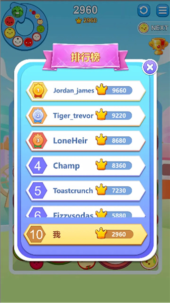 8、利用排行榜:参考高分策略,优化摆放顺序和高阶水果合成方式,突破自身记录。