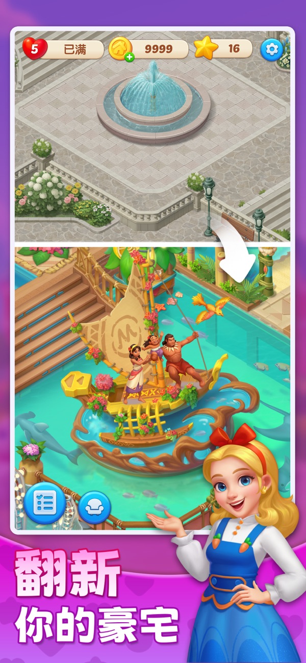 1、创新玩法:闯关完成任务,设计专属于你的豪宅和花园。