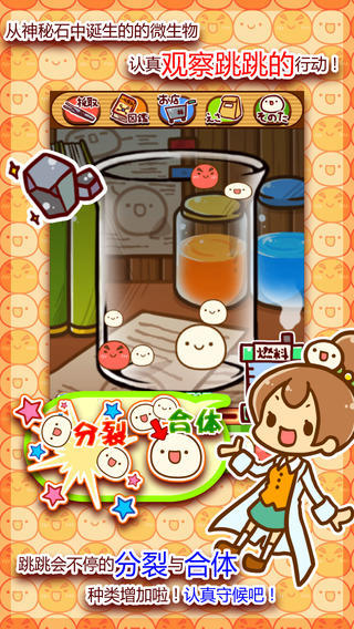 新种发现跳跳研究所是一款休闲益智类游戏,在研究锁内模拟研究培育各种微生物的实验。游戏采用卡通动画制作的游戏,玩家可自行研究培育各种新型的微生物。在一个小小的容器中用显微镜观察他们一点一点成长发育,体验培养微生物的独特感受。游戏以研究培养为主玩家可以给微生物加入各种试剂做反应研究。