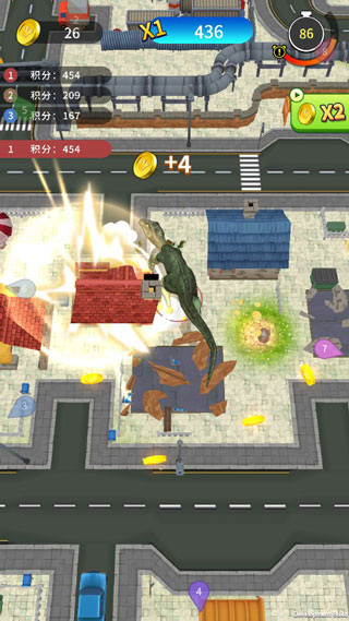 破坏的建筑会增加积分,积分会决定恐龙个头的大小并直观表现出玩家本局表现。破坏建筑还会掉落金币。金币是解锁高级恐龙的必备资源,只要每场打出精彩表现,就可以获得更多金币。