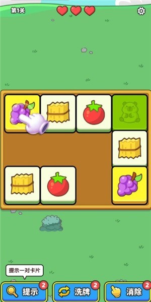 1、跟随新手引导点击图案相同的卡牌进行消除。