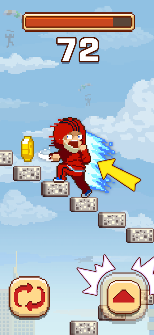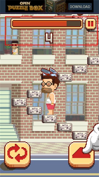 v1.3.268挑战巅峰是一款玩法简单的休闲益智类小游戏,玩家将要扮演一位充满激情的社畜大叔,你将不断挑战自我,从枯燥的日常生活中挣脱出来,感受突破极限的快感。游戏的操作十分的简单,一共只有两个按键需要玩家操作,但是却十分考验玩家自身的应变能力和操作能力,来挑战一下自己,看看自己最高能跑到哪里吧。