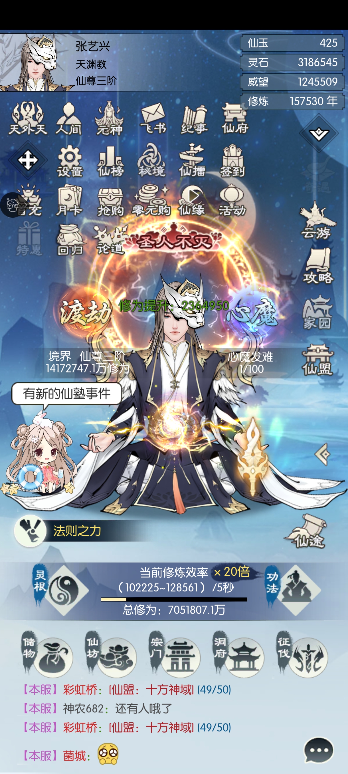 七日仙玉使用:买了以上这些,仙玉到手先别用,现在手上有礼包给的680和月卡268仙玉,我们要在七日活动结束前买总共1200仙玉的五转圣功与灵力丹。总共还差300多仙玉,可以在成就里拿至少200仙玉,还有月卡每日领取的30仙玉,可以在第六天凑齐所有仙玉。想要白嫖长老传功另想办法,比如加群找大量礼包码。