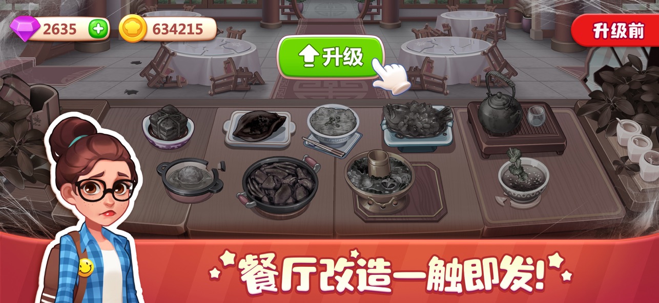 4、玩家在进入到关卡5-1时,就会自动解锁餐厅升级功能,点击它。你可以用赚到的金币购买食材,解锁新的厨具了。