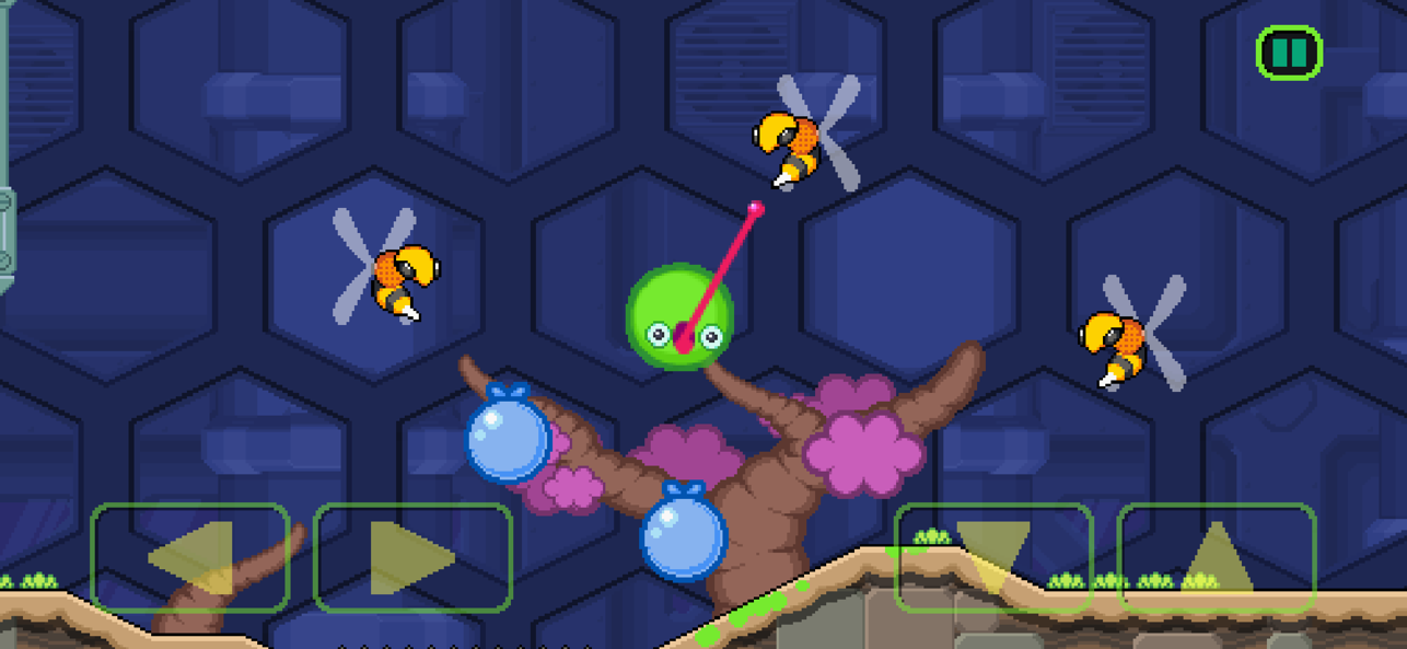2、进入游戏之后,我们就发现主人公小粘液了,绿色的身体两个大大的眼睛,跟个三角形小汽车似得,不要小看它,它会让你目瞪口呆的,接下来我们就开始我们的小粘液冒险之旅,大家可以看到界面上方有个提示,两个左右的箭头,下边写着to move,意思就是按方向键的左右来控制小粘液的行动,如图: