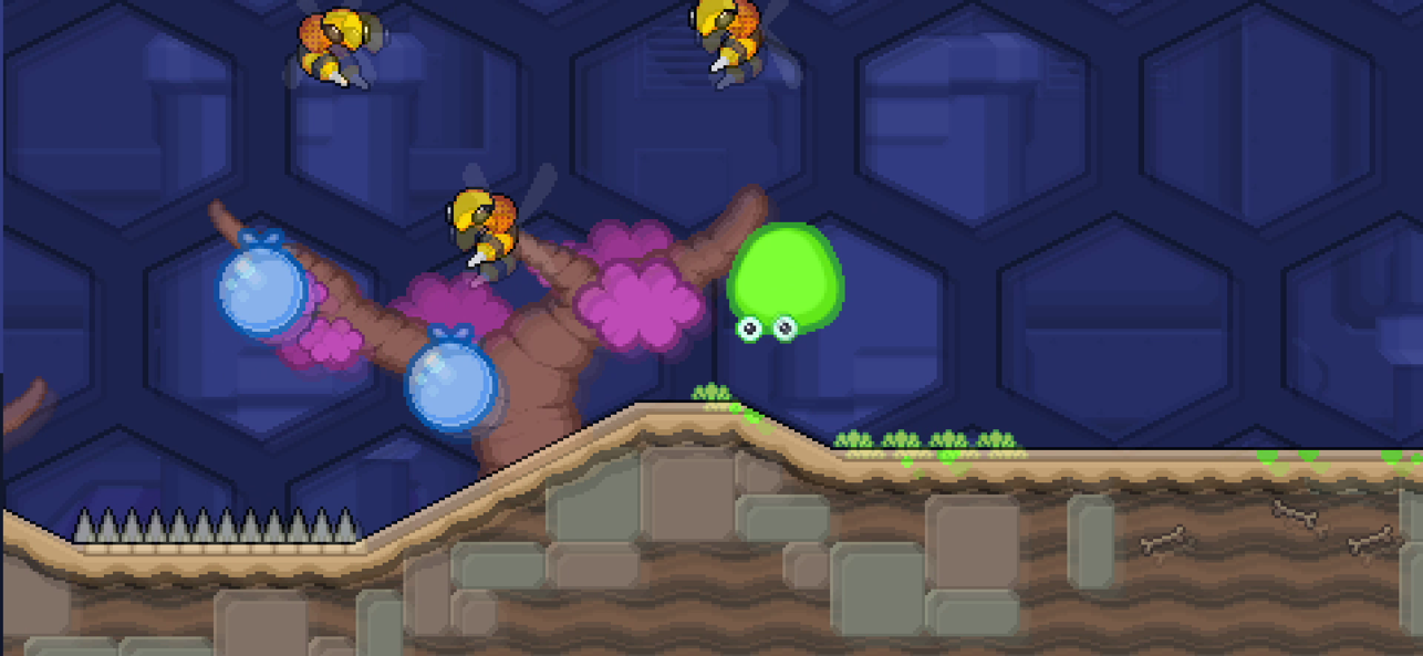 4、当我们的小粘液来到一个高台前的时候,发现上不去了,不过没关系,咱们的小粘液还有一项技能那就是飞檐走壁,说的夸张了点,其实是跳跃功能,游戏中也有提示,有个向上的箭头,下边写着to jump,也就是按方向键上就是跳跃。