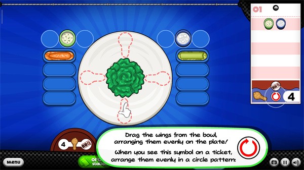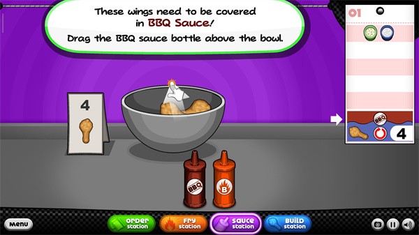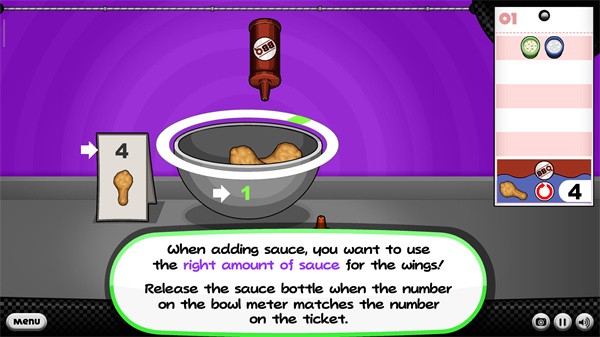 11、加酱汁的时候,你要用适量的酱汁蘸鸡翅上,当碗表上的数字与菜单上的数字相匹配时,释放酱汁瓶;