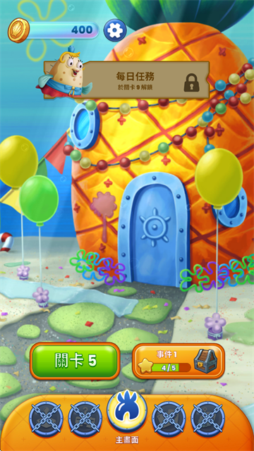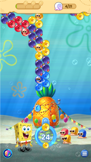 海绵宝宝泡泡爆破是一款以海绵宝宝动画为基础改编的休闲闯关类手游,玩家将扮演主角海绵宝宝展开一场奇妙的闯关之旅。游戏的玩法类似与泡泡龙,玩家需要将相同颜色的泡泡发射到一起进行消除,通过消除关卡中全部的泡泡来通关成功。游戏为玩家准备了非常多样的道具,多种不同的闯关方式等你来体验,感兴趣的小伙伴快来试试吧。