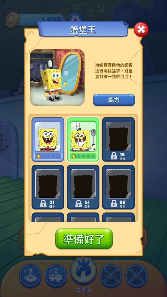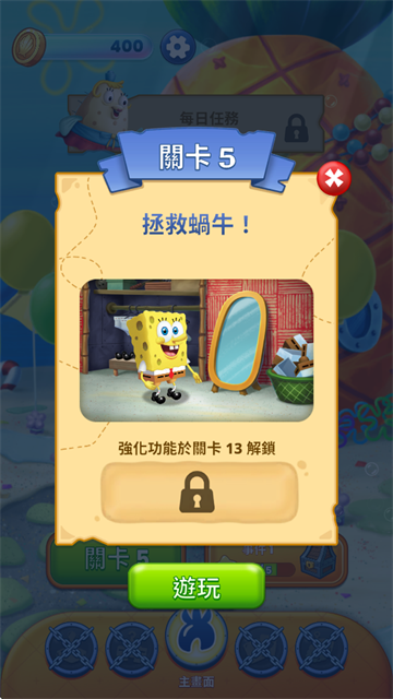3、为每一个关卡选择完美的服装,从经典的海绵宝宝背带裤、蟹老板制服到其他有趣的装束,一定会为你带来惊喜!