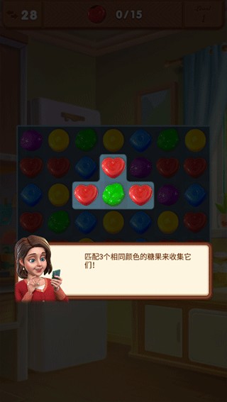 2、进入关卡,匹配3个相同颜色的糖果来收集他们
