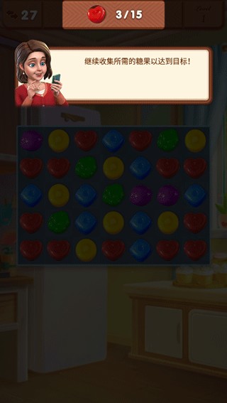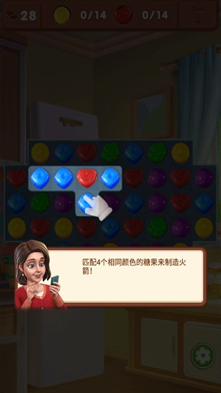 2.交换相配的糖果,完成各个关卡,完成任务并装饰自己的房屋
