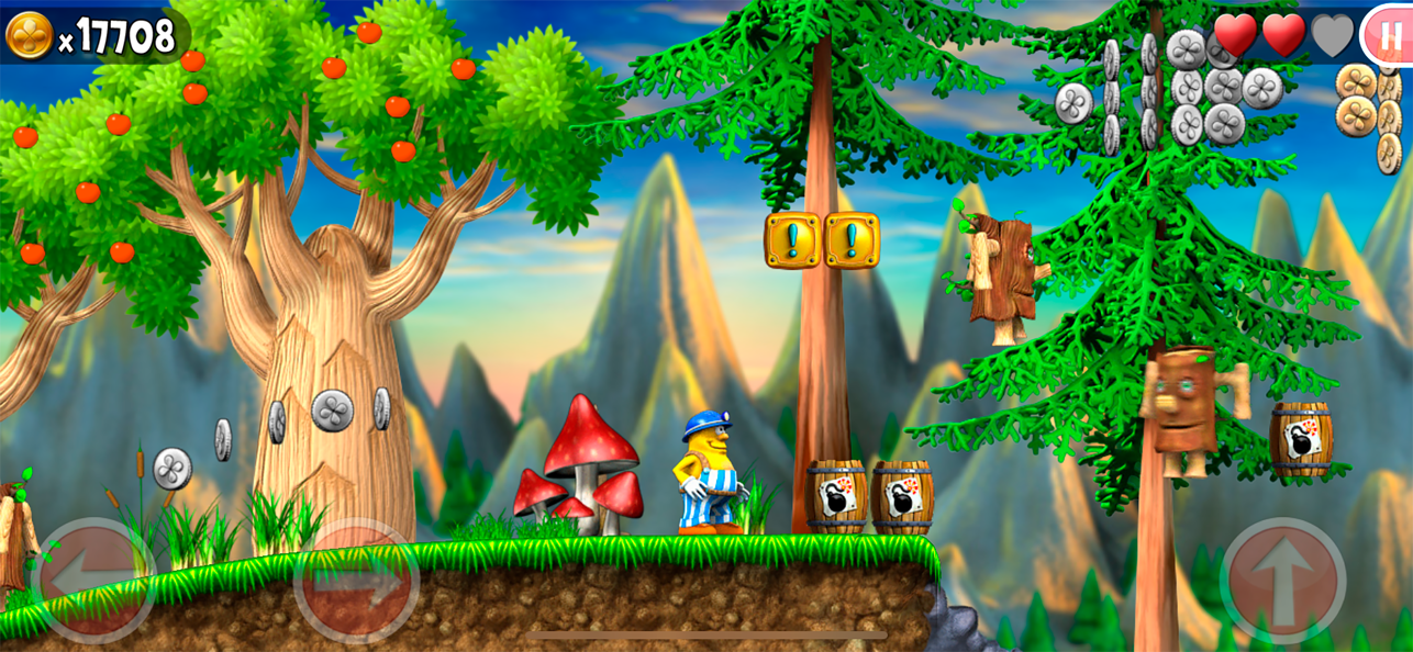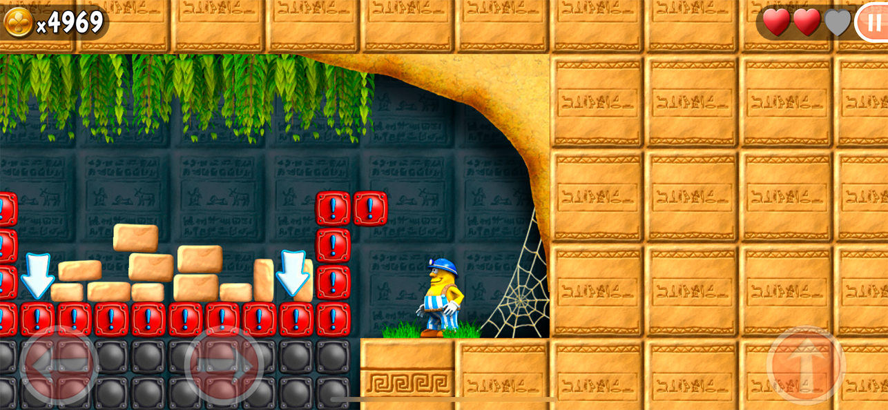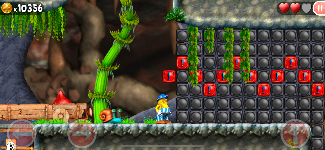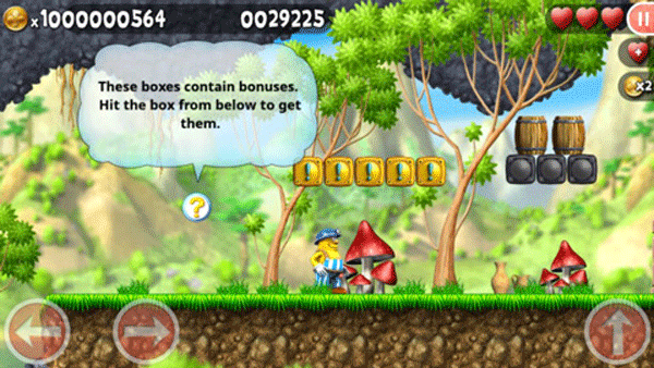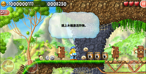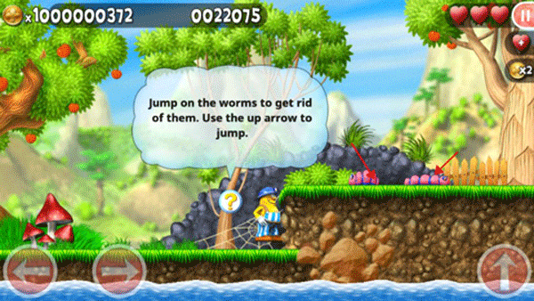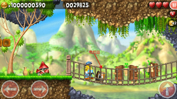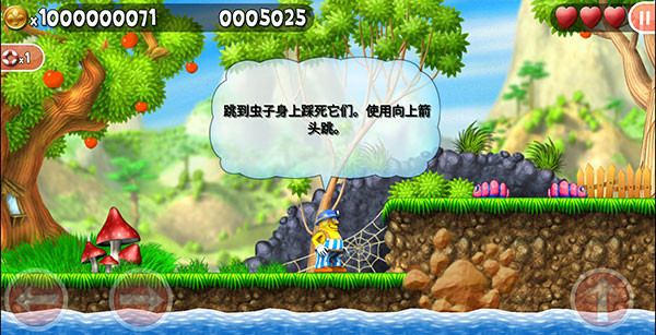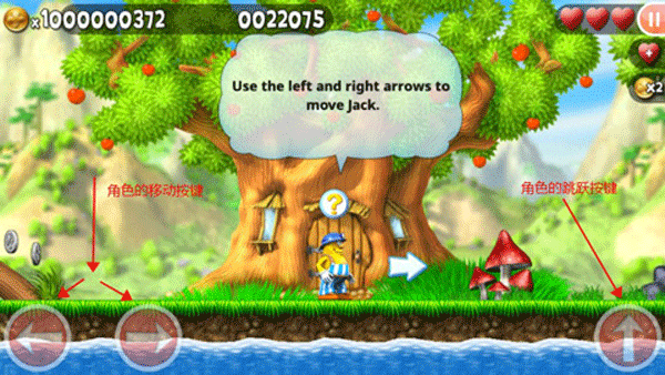 1、左边的两个按键分别控制前进和后退,右边的按键控制跳跃,按两下则是二段跳,杰克有3颗爱心,碰到虫子等怪物会消耗爱心。
