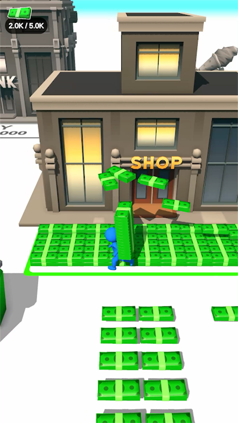 1、在这里玩家的任务就是不断挣钱,搬运钞票来扩展区域。