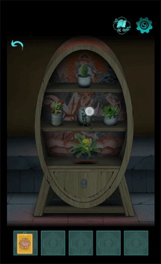 左边屋子→火钳、柜子里的《植物图鉴》看名字→庭院左边植物柜,后面图像呼应名字→得到镜片→左屋→放镜子→折射四个图案和圆点→•代表顺序→风禅莲火→铁牌→去庭院右边墙面加上→得到密码→开大殿门→进入