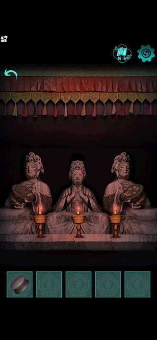 根据外面参照+左边破开盒子→连线题→解开右边盒子→圆佛头饰品+地上图案→外面左边机关,供香→上香→五角星与外面香炉关联→打开开关→右左右(根据头上苔藓)