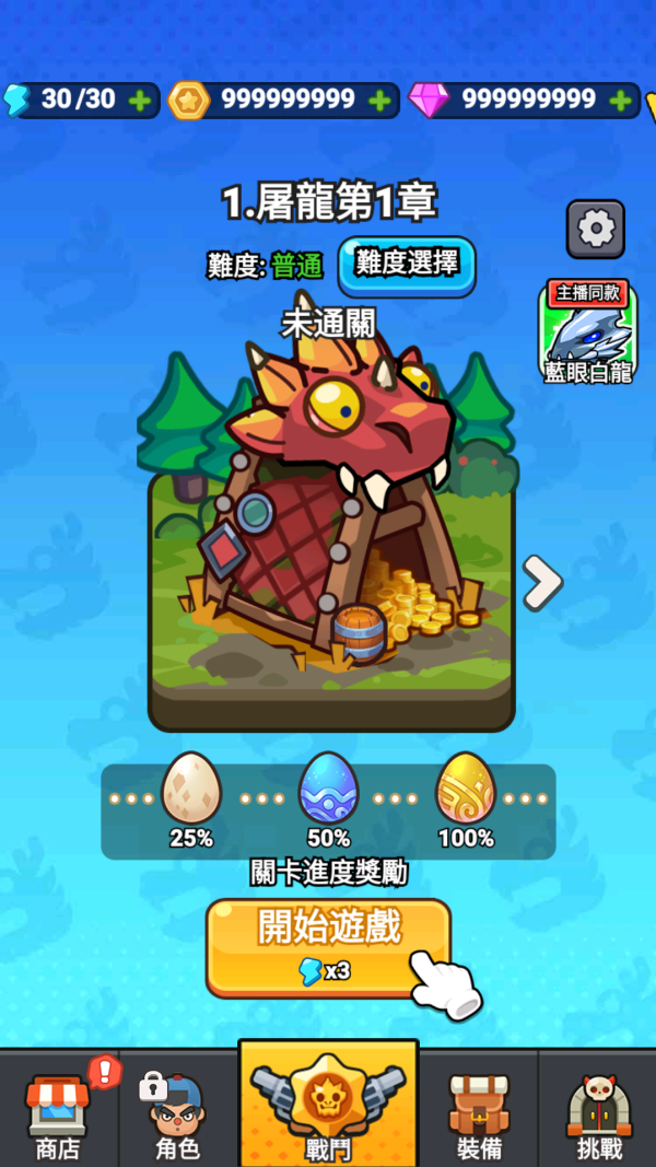 2、在【战斗】界面中,选择第一章屠龙,消耗3点体力,点击【开始游戏】。