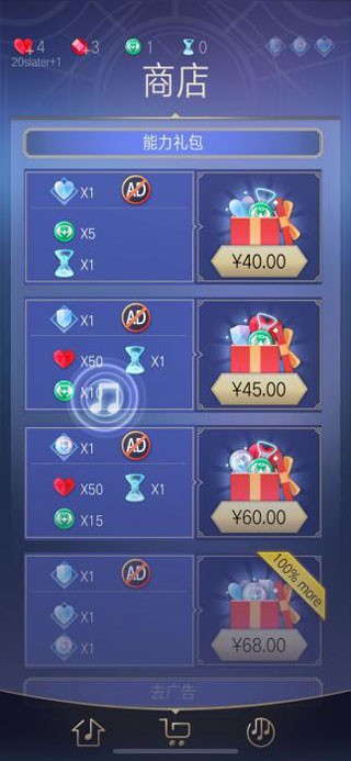 ¥40:每天2小时无限生命值、5复活道具、1魔法沙漏、去除弹窗广告;