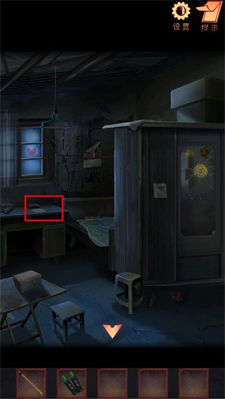 7、找到床上的笔盒,密码“乌龟、花、脚印、蝴蝶”;打开文具盒,获得道具:铅笔和电池
