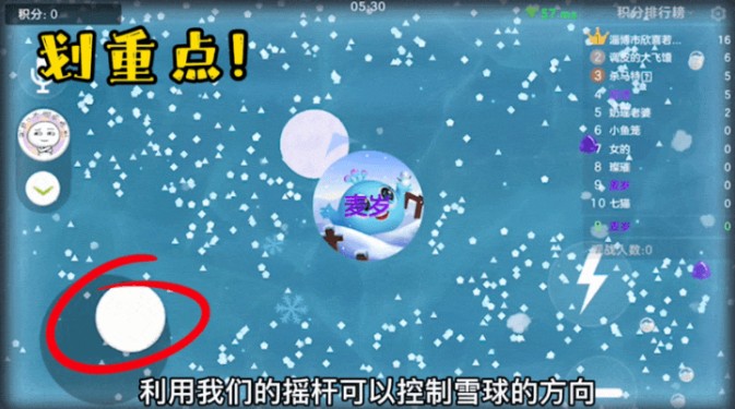 冰雪大乱斗的模式里,地图上都是白色的小雪花,吞噬小雪花可以增大体积,地图上还会随机出现圆滚滚的雪球,当我们的球体触碰到雪球,那么雪球就会粘附在我们的球体之上,一次只能携带一个雪球。利用我们的摇杆可以控制雪球的方向,点击吐孢子键可以发射雪球。