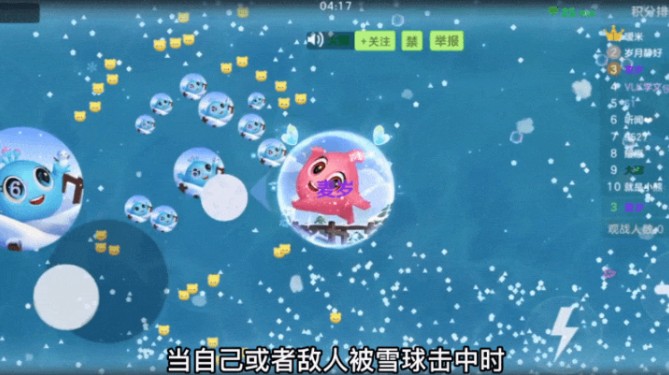 当自己或者敌人被雪球击中时,都会炸开分身,丢失体积。这里有个小技巧哦,雪球带在身上触碰敌人也可以使敌人炸开分身,当被大体积的敌人追着跑时候,不妨带上一个雪球,时刻准备反杀!