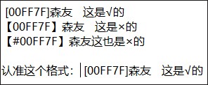 3、把 [代码]放在名字前面。例如 [00FF7F]森友 。然后进入游戏中,就可以看到自己变成指定的颜色啦。