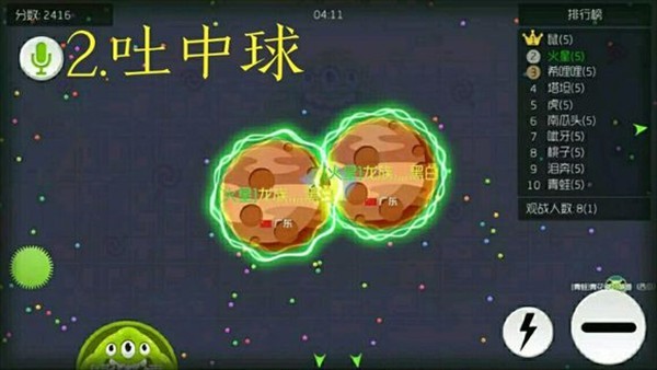 4、【速分法(快速分身法)】(自创)虽然此技术可以惯用减号分身达到快速的效果,但是分身也是有个度的。在团队模式中,当你的体重大于你的球友分身,你分出来的分身体重也大于球友,这时点击减号,往后拉(不使用往后拉前面分的身会被敌球所吃掉,达不到配合)本技术教程完毕。