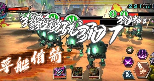 果宝三国中经典的诸葛亮草船借箭,在游戏中变成了一次性大范围箭雨AOE,对大量敌人造成密集伤害
