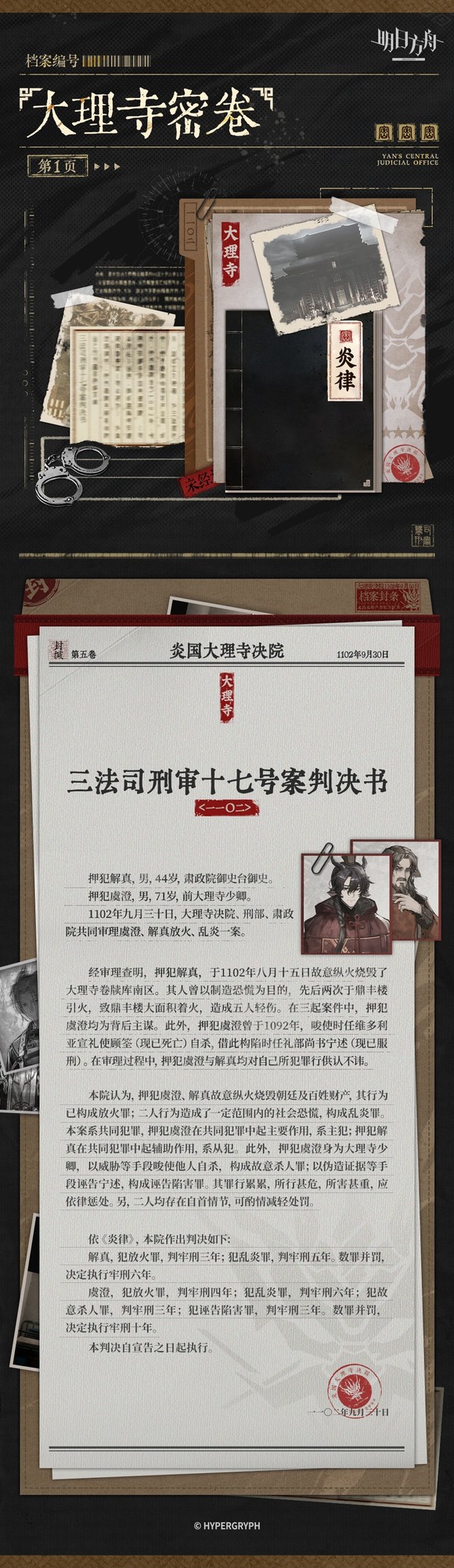 1102年十二月冬至日,历时数月,被焚毁的大理寺卷牍库终于重建完毕,这座庄严的建筑恢复了往日威严的形制。竣工的这一天,一封新的判决书被归入卷牍库,与无数尘封的卷宗放在了一起;与此同时,大理寺卿谌彻则将一封信收入自己的书柜深处。