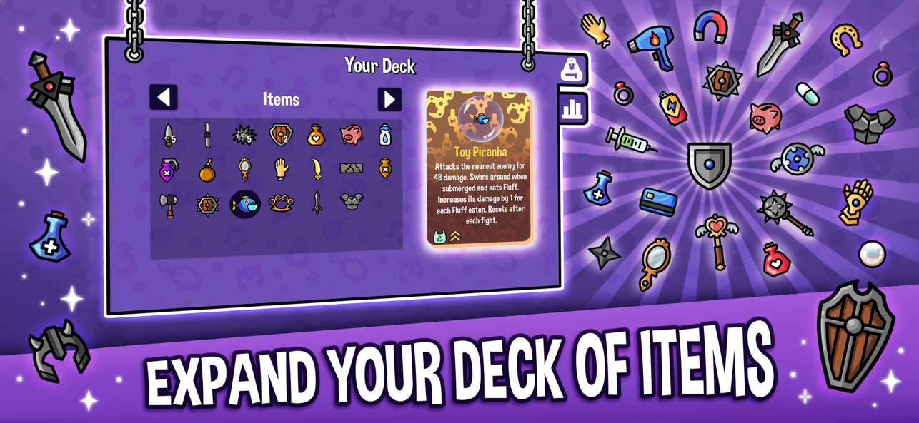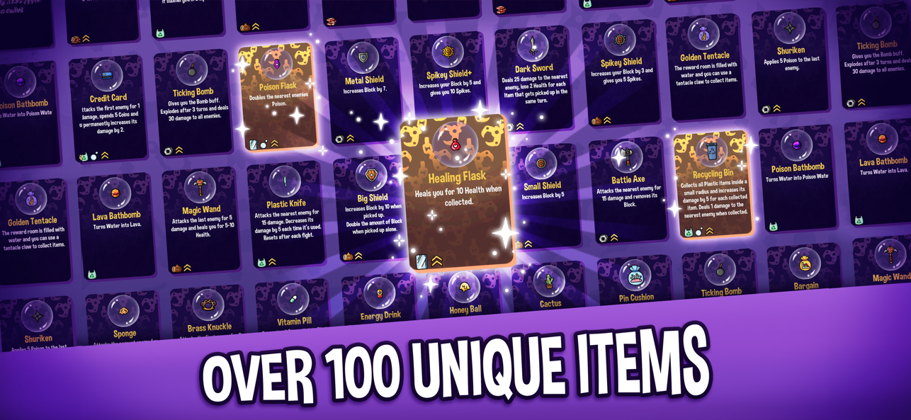 收集并升级你的道具池,包括强大的武器、物品和小饰品。有无数种组合,创造你的终极策略来征服地牢。