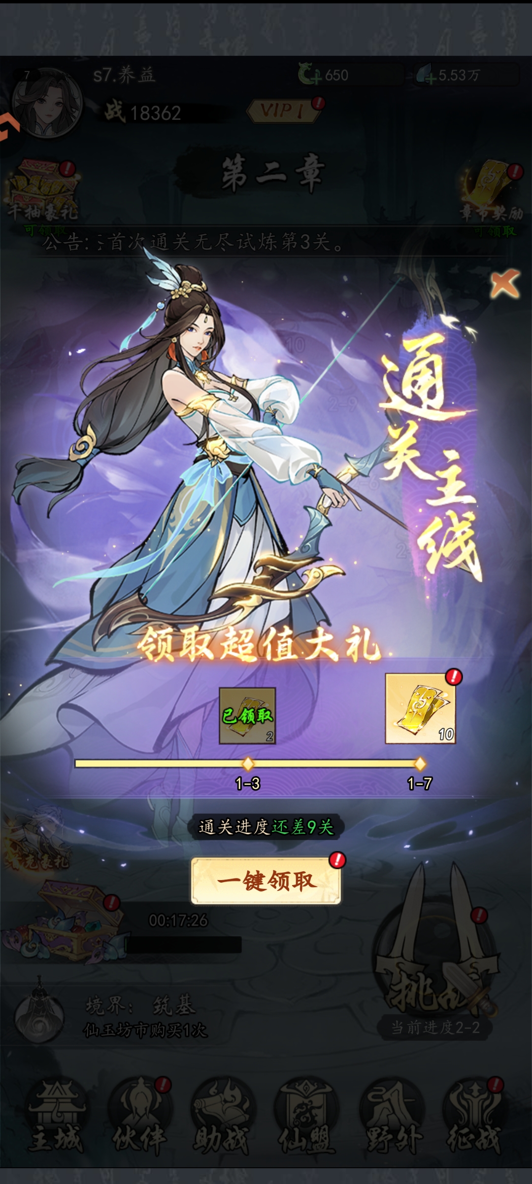 快速解锁关键功能:初期应优先完成新手引导任务,快速推图提高收益,解锁飞升之路、伙伴、仙盟、野外试炼等核心系统。