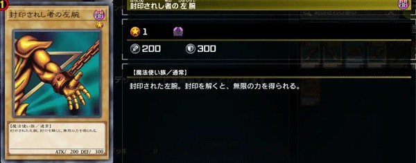 效果:这张卡和「被封印者的右腕」「被封印者的左腕」「被封印者的右足」「被封印者的左足」在手卡全部齐集时,自己决斗胜利。