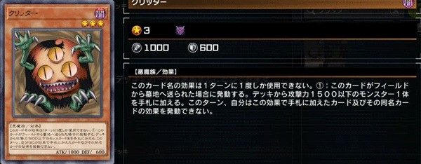 效果:这个卡名的效果1回合只能使用1次。①:这张卡从场上送去墓地的场合发动。从卡组把1只攻击力1500以下的怪兽加入手卡。这个回合,自己不能作这个效果加入手卡的卡以及那些同名卡的发动。