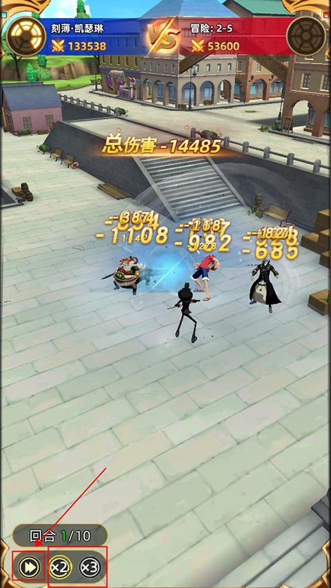 4、进入关卡后,会自动回合战斗。玩家可以点击倍速按钮加快战斗节奏,在完成2回合战斗后即可点击左下角三角形跳过战斗。