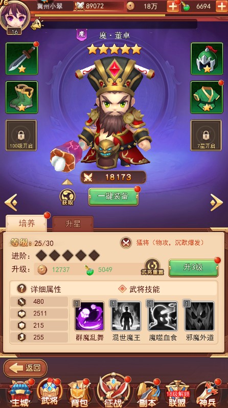 3、融合功能就像提升武将星级,但限制为只能将4星升至5星,5星升至6星。6星以上的提升则需要在武将升星界面完成。