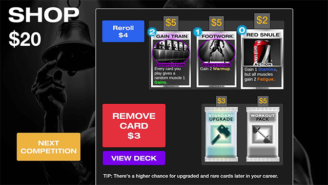 7、比赛胜利后会获得金币奖励,金币可用于购买新的训练卡牌,持续挑战更强的对手,向健身冠军的目标迈进。