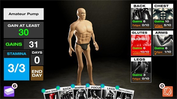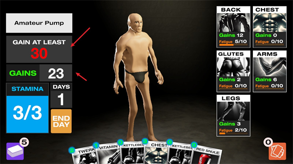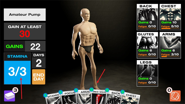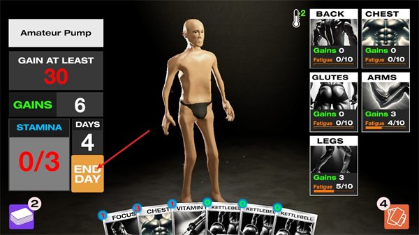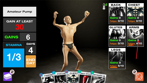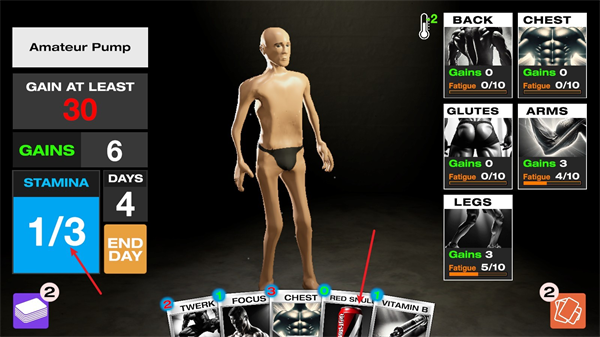 4、右侧则展示了不同部位的肌肉数量,每张卡牌能增加的肌肉量各不相同,合理使用至关重要。