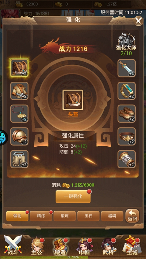 使用强化石等材料对装备进行强化,提高装备的属性加成。强化等级越高,提升的属性值也越多。