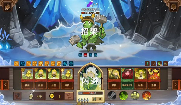 冷冻装置打出寒冷状态攻击降至1举盾免伤,应对双狼狼群多段伤害消耗3费,建议雪地靴多一点体力蹭伤害或加buff