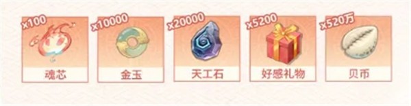 少主登录游戏即可在邮箱中领取魂芯*100,金玉*1万,天工石*2万,好感礼物*5200,贝币*520万!