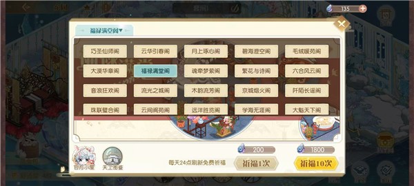 往期活动祈福均在巧圣阁中常驻开启。少主可在【巧圣阁-巧圣仙师阁】下拉列表中选择自己想要祈福的主题家具阁,消耗「天工石」进行祈福,获取主题家具。