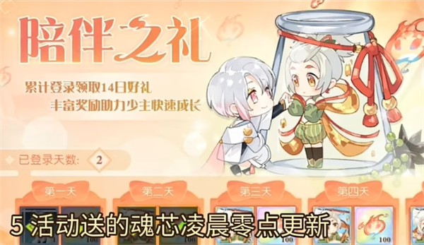 每日登录游戏即可领取奖励,首日可领取万寿羹时装「研思不寐」与「魂芯*100」,登录14日共计可领取「调料*70」「魂芯*1400」!