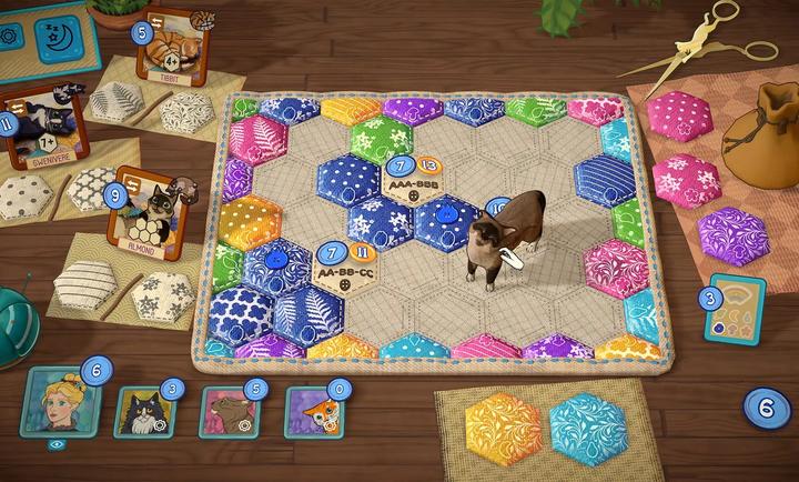 制作被子时,玩家需要思考如何组合图案和颜色来得分以及吸引猫咪,具有一定的策略性和益智性。